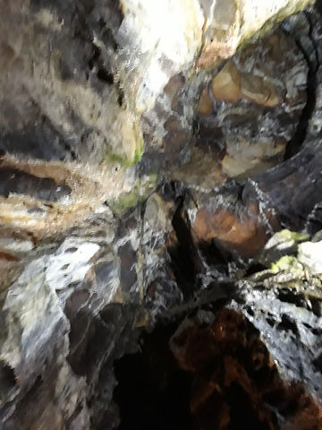 It is interesting how he explained the care required in the mining to not disturb the colouring of the Blue John in the mining processes, which if failed leaves the mineral worthless. The crystalline formation of the gem can be seen in the these pictures I took in the dark cavern.